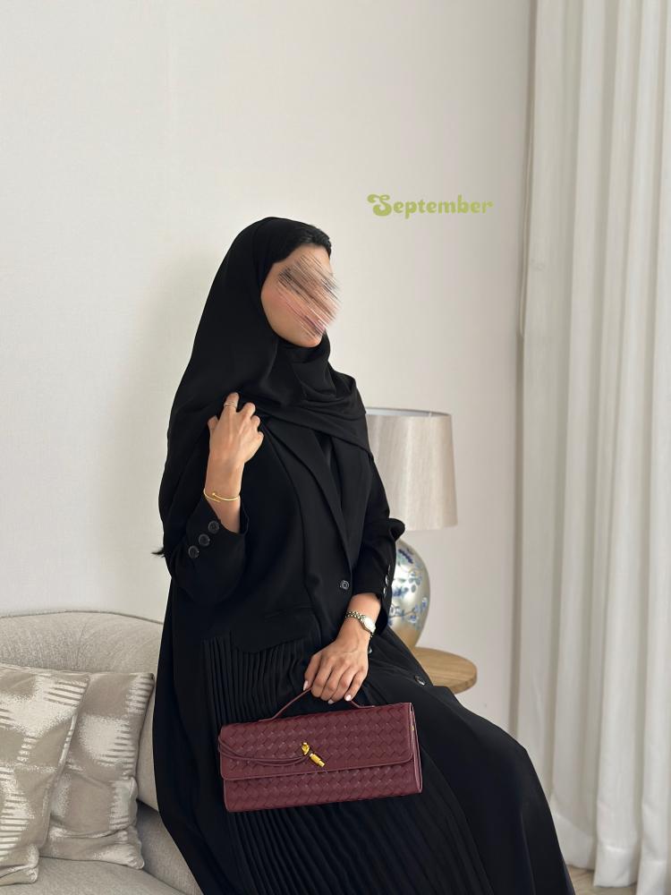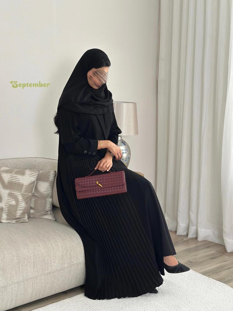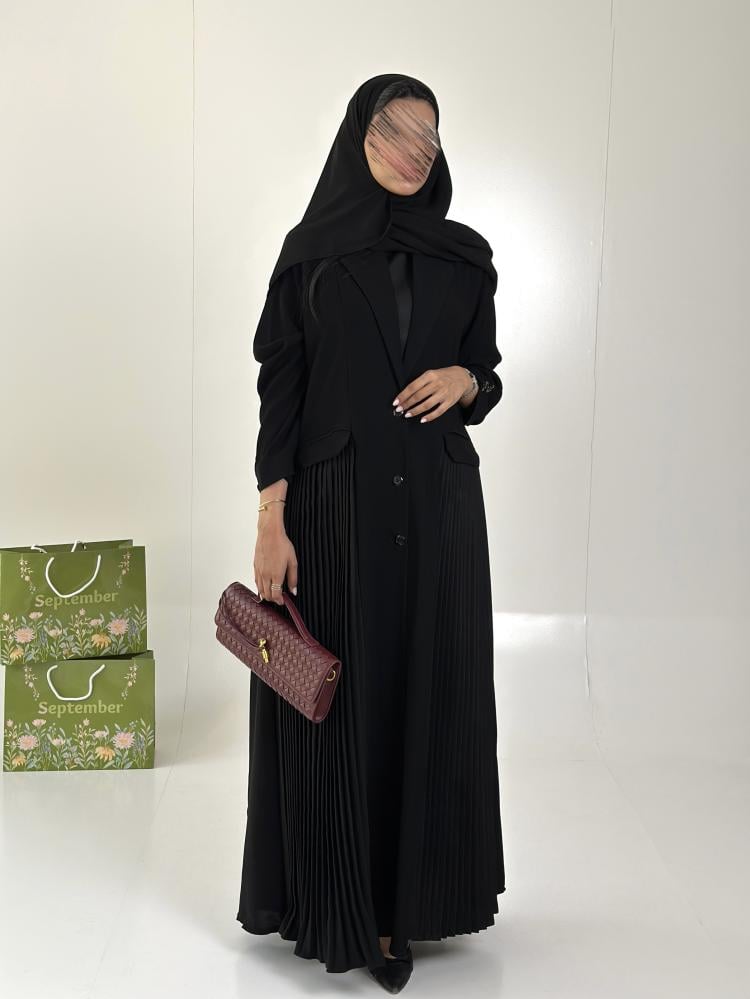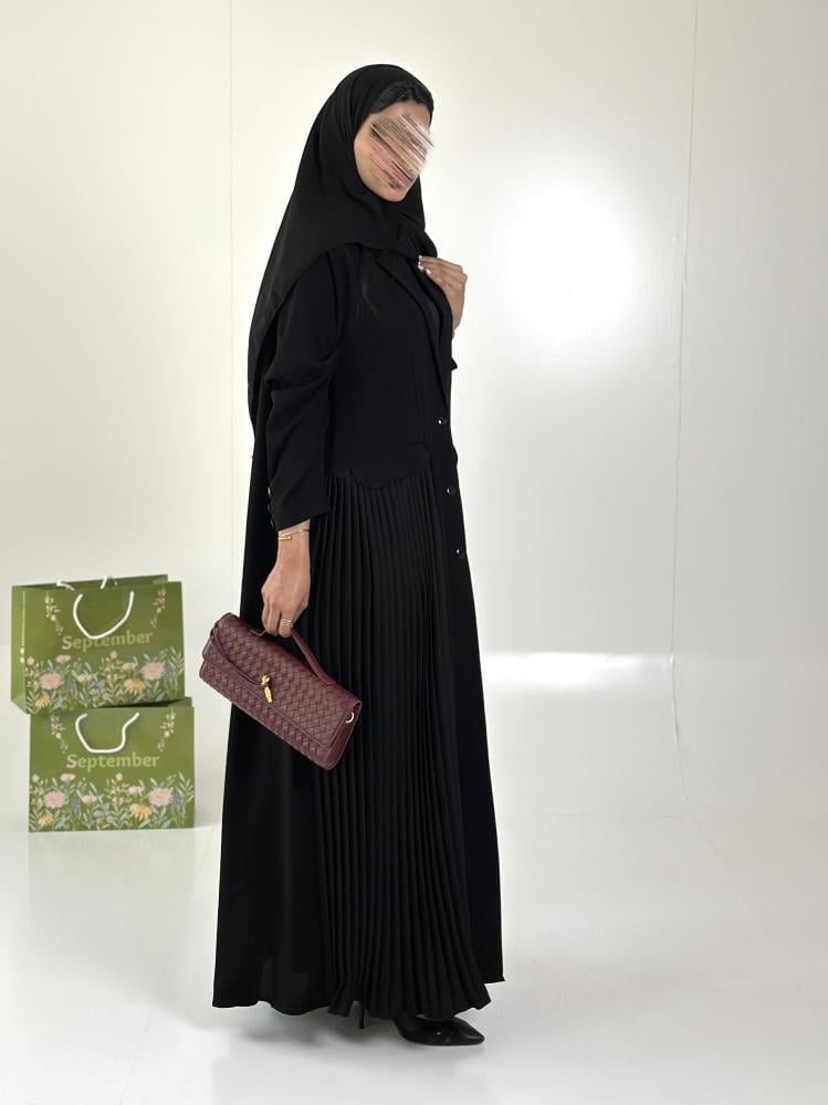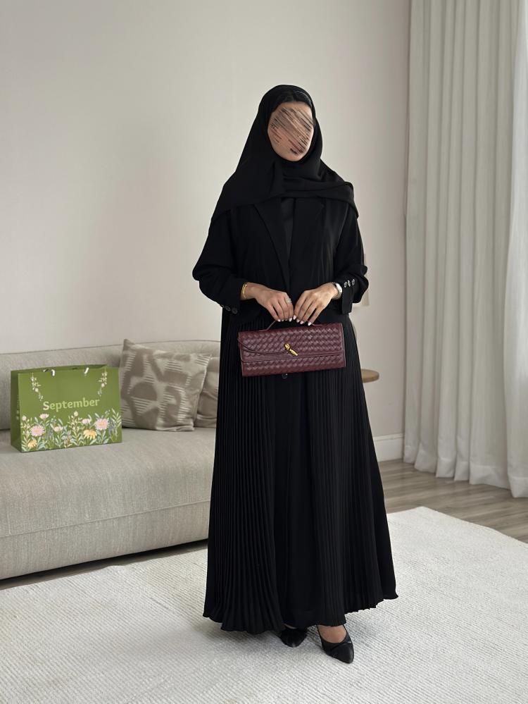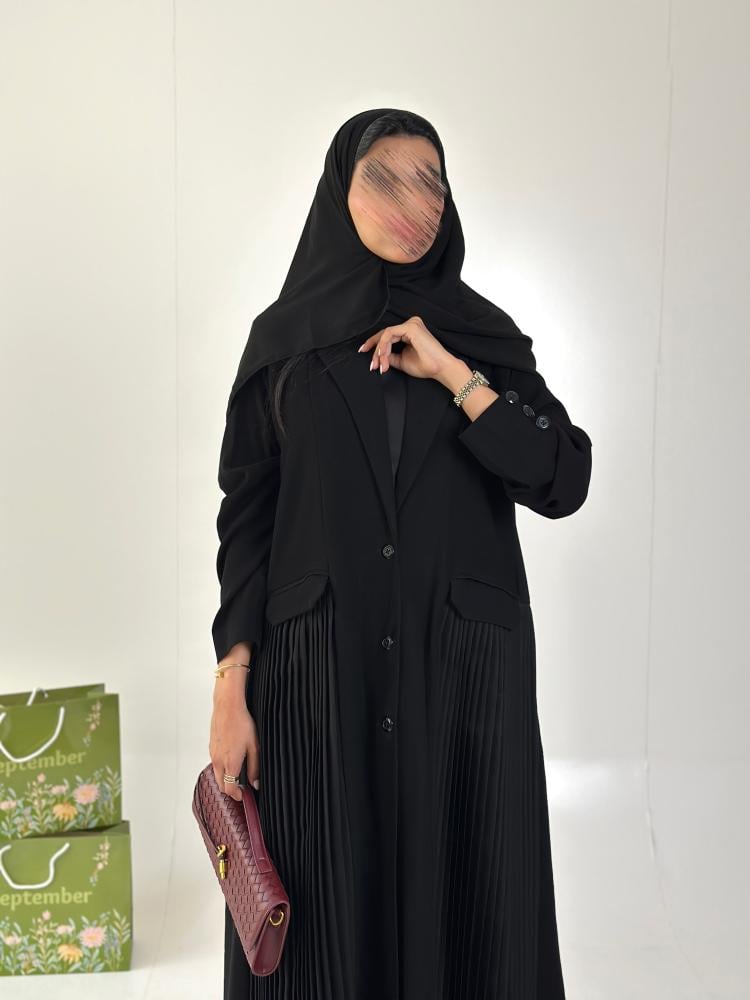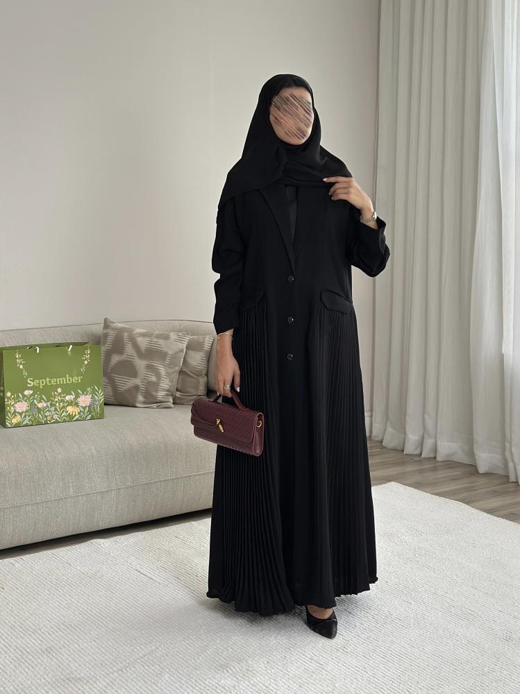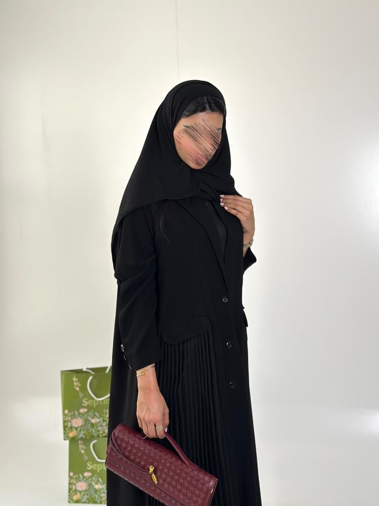 عباية رسمية باللون الأسود مصممة من قماش كريب ملكي، بقصة أنيقة. يميزها كسرات ناعمة من الأمام تضيف حركة فخمة ولمسة ناعمة للتصميم، مع جيوب أمامية عملية تمنحها طابعًا عصريًا وعمليًا. خيار مثالي للدوام أو المناسبات الرسمية، تجمع بين الفخامة والراحة في كل تفصيلة.