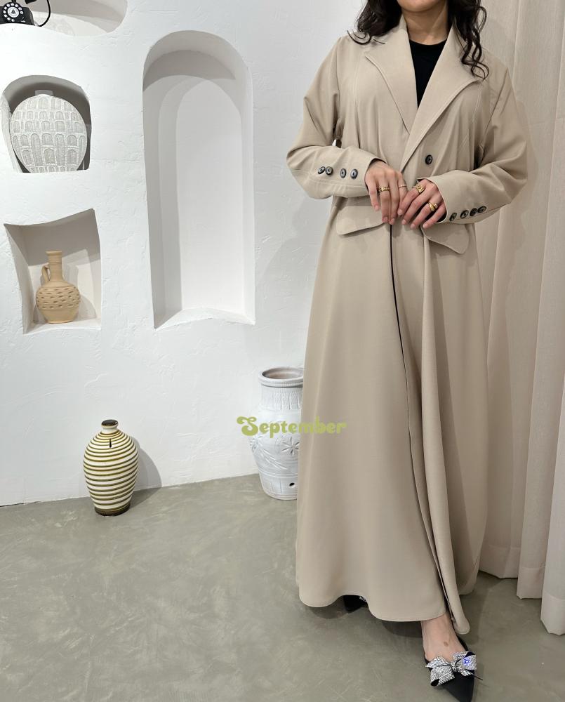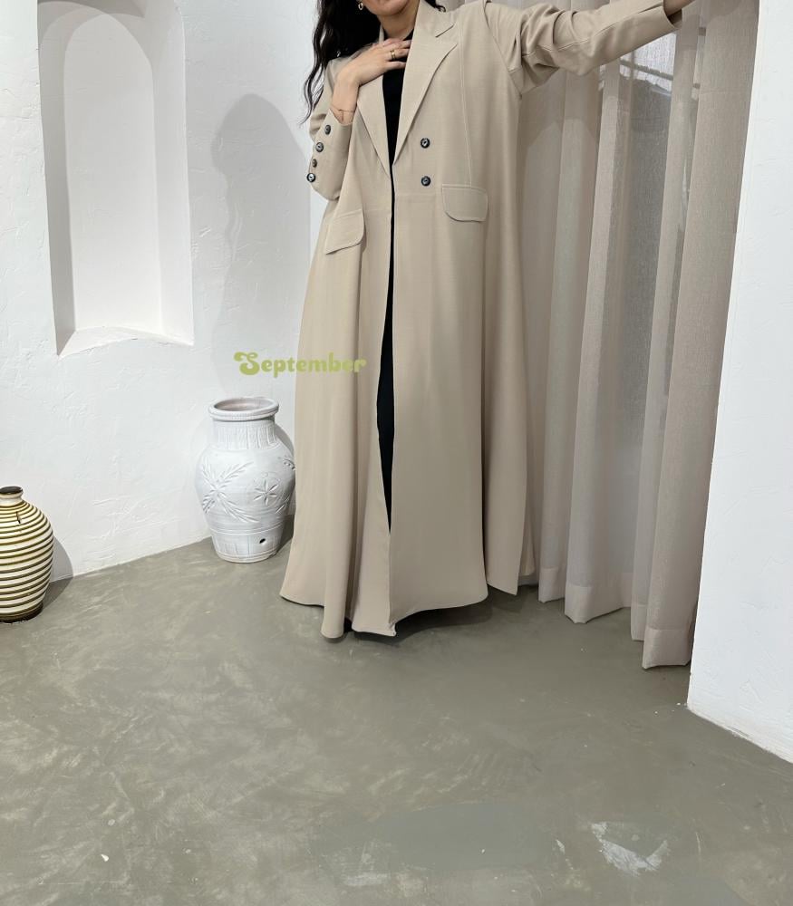 عباية أنيقة كلاسيكية على شكل بليزر مصممة باللون بيج. العباية مصممة من قماش الكتان الفاخر.