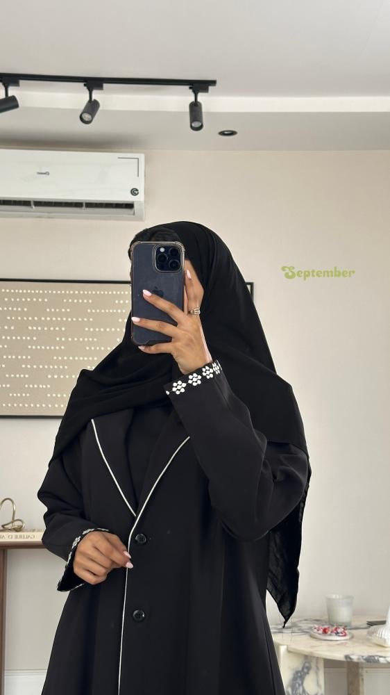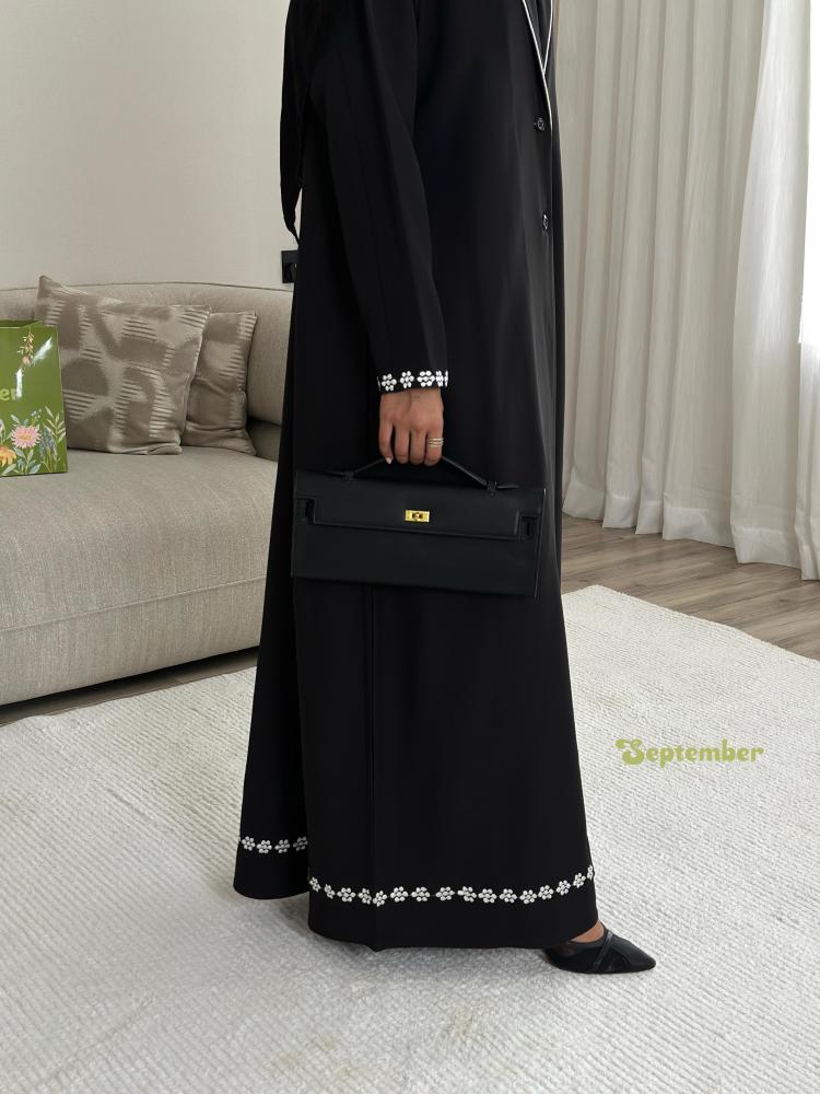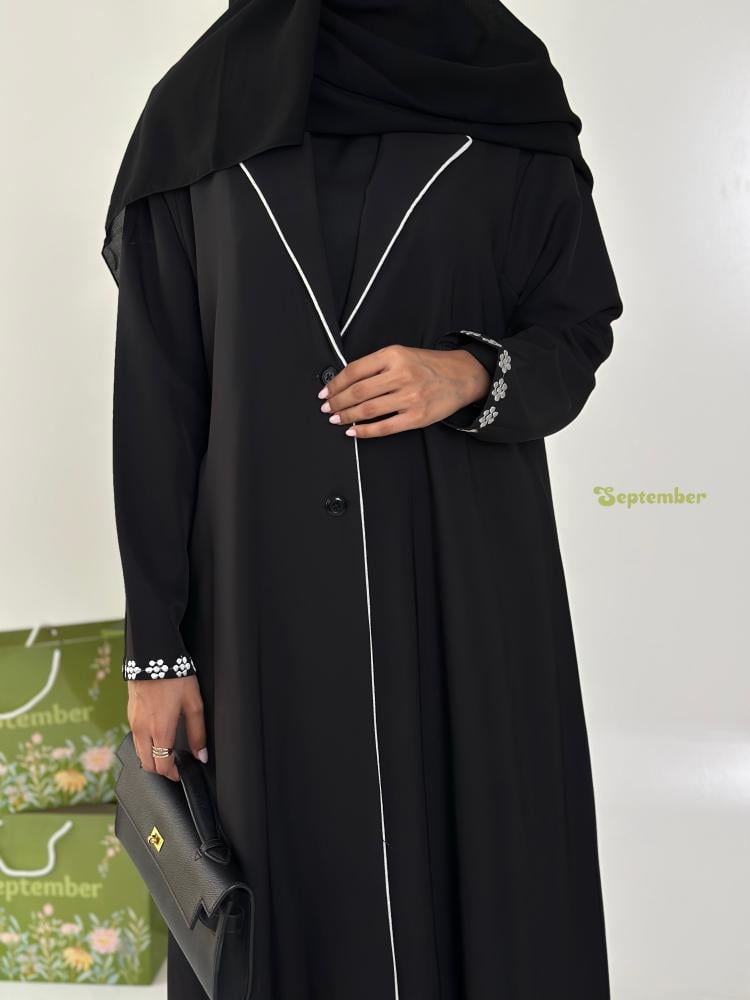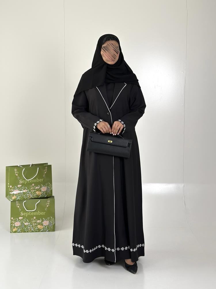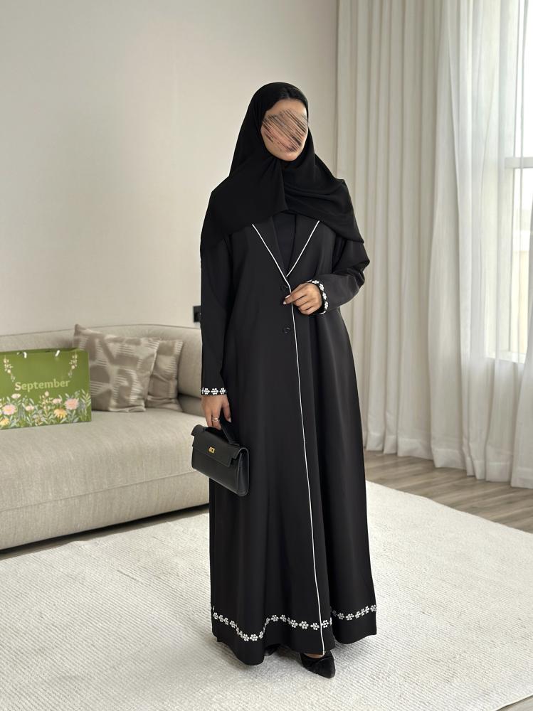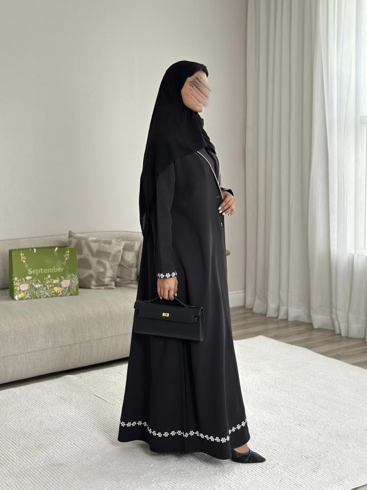 عباية رسمية سوداء بتصميم ناعم وأنيق، يزينها تطريز ورد فاخر على أطراف الأكمام وأسفل العباية، يضفي لمسة أنثوية راقية. مزودة بأزرار أمامية تضيف لمسة كلاسيكية عملية، وتُكمل الطابع الفخم للتصميم. خيار مثالي للإطلالات اليومية الرسمية والمناسبات الهادئة، تجمع بين البساطة والرقي بكل أناقة.